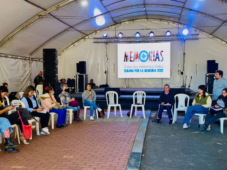 Cinco carpas blancas fueron el escenario de un vaivén de conversas y juntanzas que tenían como máxima un verbo: escuchar. Escuchar los dolores, los miedos, sus formas de tramitarlo. Los anhelos, las esperanzas, lo que tienen guardado. Las resistencias, la fuerza, las convicciones. Escuchar para seguir cruzándose en los caminos de las memorias, que son muchas y son todas, como también sus propósitos más íntimos. Memorias que son anterior a todo, porque está en el cosmos, en el universo, como explicó José Pereira, líder del resguardo muisca de Cota, Cundinamarca, en una armonización que precedió a la jornada más luminosa de la Semana por la Memoria, una apuesta del Centro Nacional de Memoria Histórica (CNMH) para juntar y escuchar a las víctimas, organizaciones de víctimas, artistas, defensorxs de los Derechos Humanos y cualquier otra persona que tuviera algo que decir y aportar a esa paz total que “será con todos y todas, o no será”, como mencionó la directora del CNMH, María Gaitán, en esa tarde noche de velas encendidas y almas iluminadas.