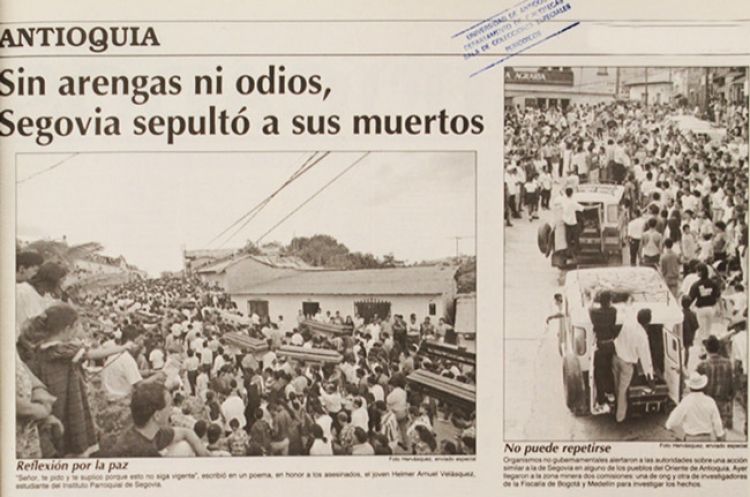 Segovia, un pequeño pueblo minero, se levanta entre las montañas del Nordeste de Antioquia. En el parque central hay un monumento que rinde homenaje a las víctimas de la masacre del 11 de noviembre de 1988. Sin embargo, su tamaño no parece hacerle justicia a la magnitud de los hechos violentos que ha padecido su población.