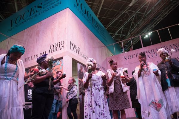 88 de esos visitantes participaron también en la programación dentro del pabellón: 103 eventos, entre conversatorios, conciertos, rituales, cine y obras de teatro. Hubo una charla cantada entre Inés Granja y Gumercindo Palencia, dos maestros tradicionales del Pacífico y el Atlántico. Una obra de teatro sobre la delicada situación que vive la Comunidad de Paz de San José de Apartadó. Un performance sobre la violencia contra las comunidades ribereñas. Un ciclo de cine con películas animadas sobre conflicto armado. Un ritual de un grupo de mujeres afrodescendientes que le cantaron a Bojayá en el aniversario de la masacre.